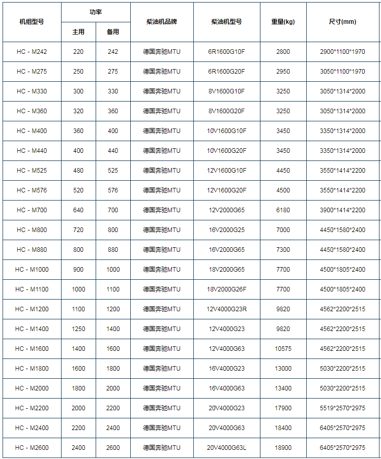 奔驰发电机组 MTU系列环保型大功率机组,选用喻家户晓的德国戴姆勒·克莱斯勒(奔驰)MTU电子喷射柴油发动机来成套。MTU的历史可追溯到十八世纪机械化时代。而今,秉承***良传统的MTU始终以其无可比拟的***技术站在***发动机生产商的前列。 MTU发动机的***良品质与凯华提出的可靠、技术***、性能、环保和长使用寿命的理念完全吻合。 我公司生产的MTU柴油发电机组就是选用家喻户晓的德国戴姆勒·克莱斯勒(奔驰)MTU电子喷射柴油发动机来成套。凯华作为专业柴油发电机组生产商,所生产的MTU发电机组具有技术***、性能卓越、环保和使用寿命长等***点。 MTU是德国戴姆勒-克莱斯勒集团的柴油机推进系统部分,也是***上的重载柴油机制造公司,其产品广泛用于军事、铁道、越野车辆,海上舰艇及电站(包括不停顿备用电站)。 早于1883年MTU便开发出了台***速车用内燃机,1901年又设计、制造了******的梅赛德斯(Mercedes)汽车,以后又陆续开发了多种***豪华的车型及发动机。1909年开始设计制造飞机发动机,1923年又开始生产***性能的柴油发动机。至今,其生产的发动机已超过174000台,用户遍及***各地。德国奔驰MTU的2000系列、4000系列是目前***的柴油发动机。是德国发动机涡轮机联盟弗里的希哈芬有限公司(MTU)于1997年开发制造上市的,包括八缸、十二缸、十六缸、十八缸、二十缸五种不同型号,输出功率范围由270KW至2720KW。 它是一种超前的设计,并装备有电子管理系统MDEC,该电子管理系统改变了传统***压油泵的概念,类似于“***轿车”上的电喷(一个缸对应一个电喷泵)。MDEC电子管理系统,即相当于在德国奔驰2000、4000系列发动机上装了一个工业电脑,并有很多传感器通过许多电缆联接至电脑上,而电脑中的模块是出厂前固化的,以确保在不同的环境、不同的工况下,都能给出一个合适的电喷量:喷油压力、喷油量、喷油角度、喷油的开启和关闭时间。 |